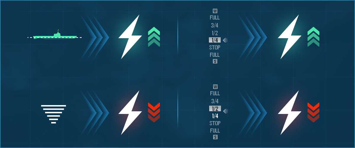 - Для перезарядки аккумуляторов перейдите в надводное положение или снизьте скорость до 1/4.