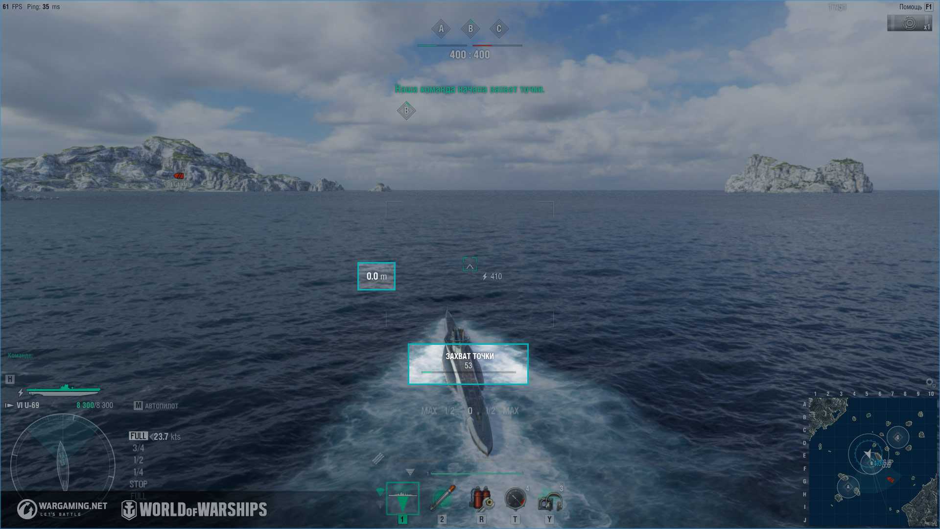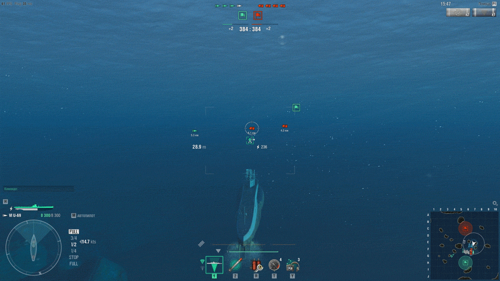 У подводных лодок небольшой запас очков боеспособности, поэтому старайтесь держаться флангов и атаковать противника с дальней дистанции или из-под воды.
