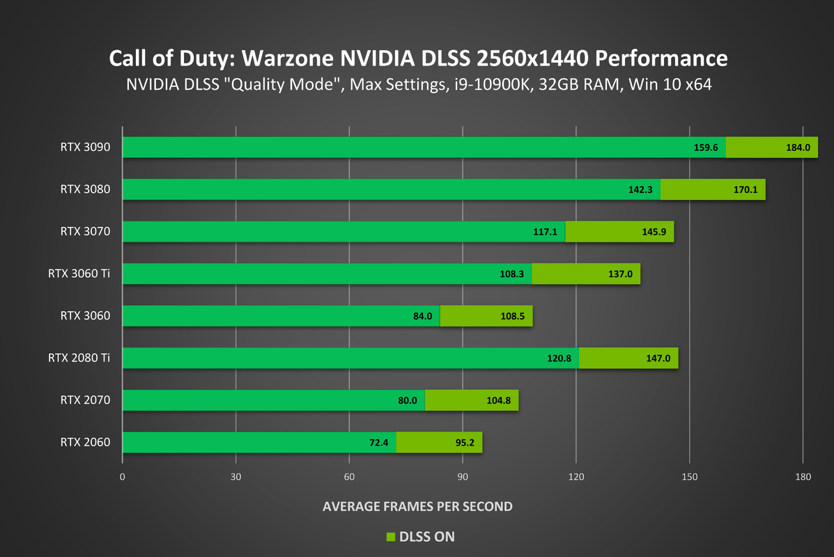 Помимо увеличения частоты кадров до желанных 60+ FPS в играх с тяжелым трекингом, DLSS также предлагает огромное преимущество для поклонников соревновательных сражений, таких как COD: Warzone и Fortnite, где высокий FPS имеет решающее значение для точности прицеливания и комфорта игры.