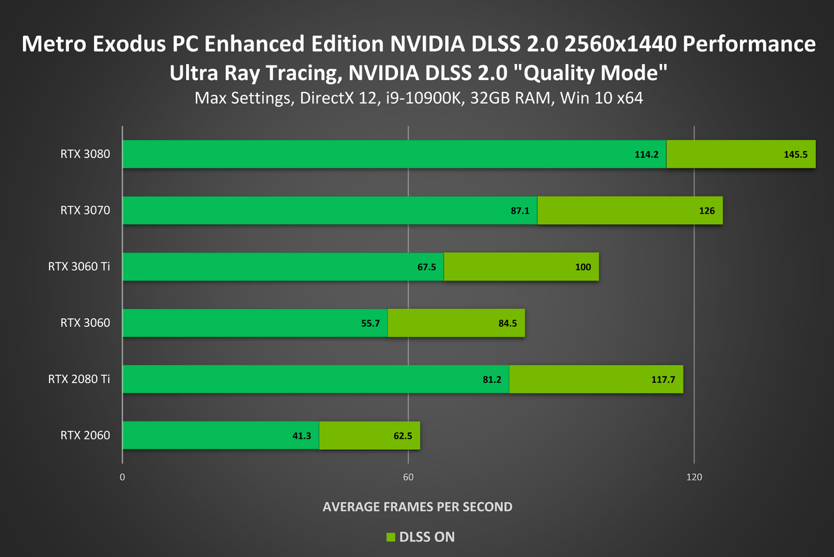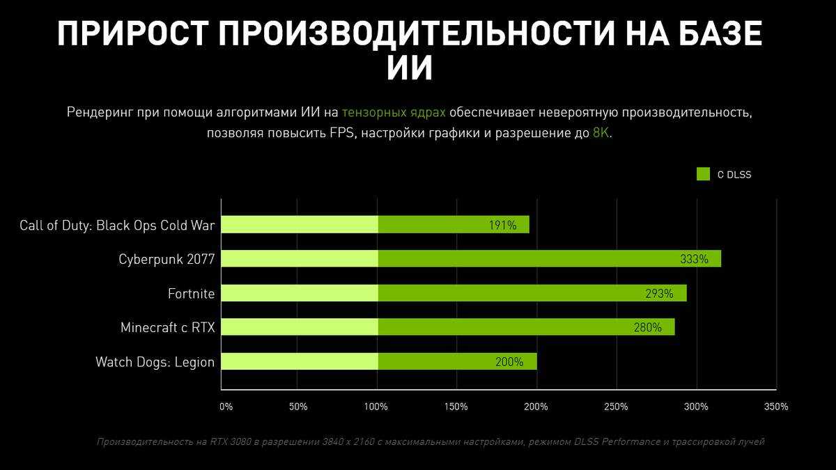 С DLSS производительность RTX 3060 часто сравнивается с гораздо более дорогими картами. Фактически, DLSS позволяет БЕСПЛАТНО получать больше кадров в секунду! Хотя разницу в качестве нужно искать с микроскопом рядом с монитором, но, честно говоря, вряд ли кто-то так играет.