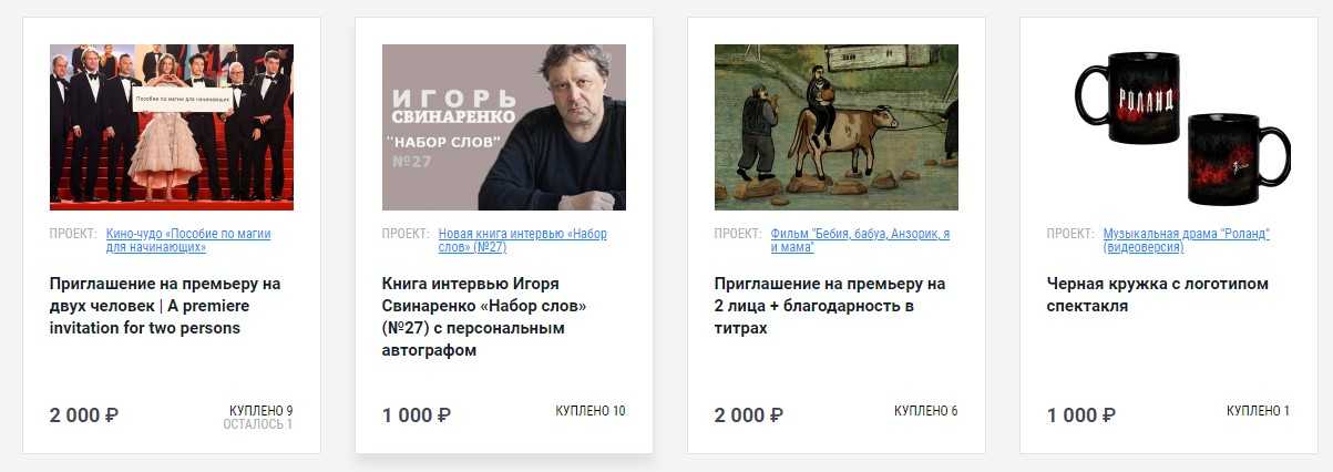 «Сделка со свободной ценой». Фаундер создает какой-то продукт, например, клип, книгу или PDF со стихами. Бэкеры сами решают, сколько за него заплатить, и могут перечислить и 100 рублей, и 50 000 рублей за одну единицу продукта.