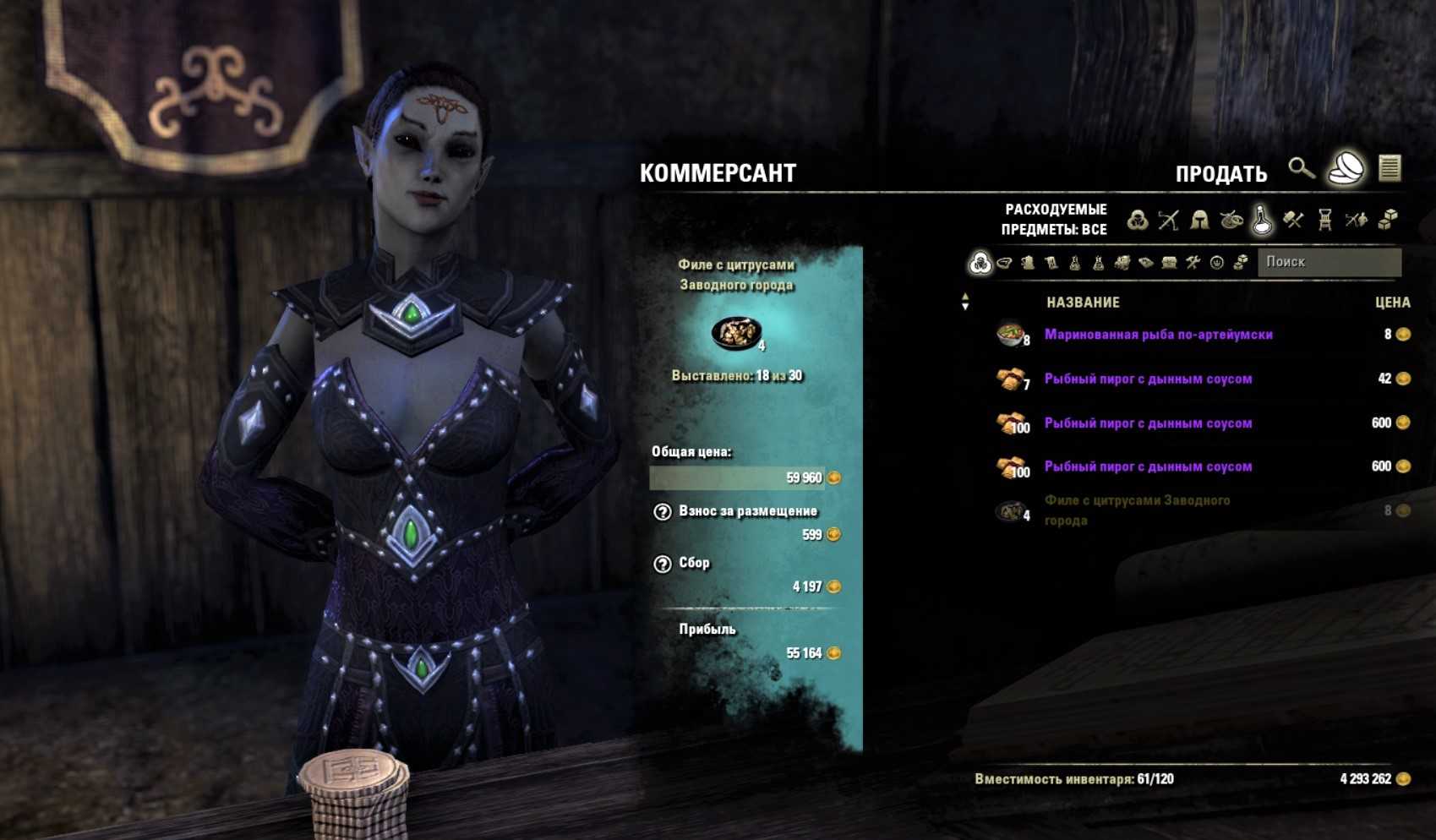 Для торговли через гильдейского торговца подходим к любому банкиру и выбираем меню «гильдейский магазин». На этом этапе обязательным к установке будет мод Tamriel Trade Centr. Этот мод позволит вам увидеть среднюю цену продаваемого вами товара. Далее заходим в раздел продать, выбираем товар и устанавливаем цену (цена устанавливается не на 1 единицу, а на целый стак товаров).