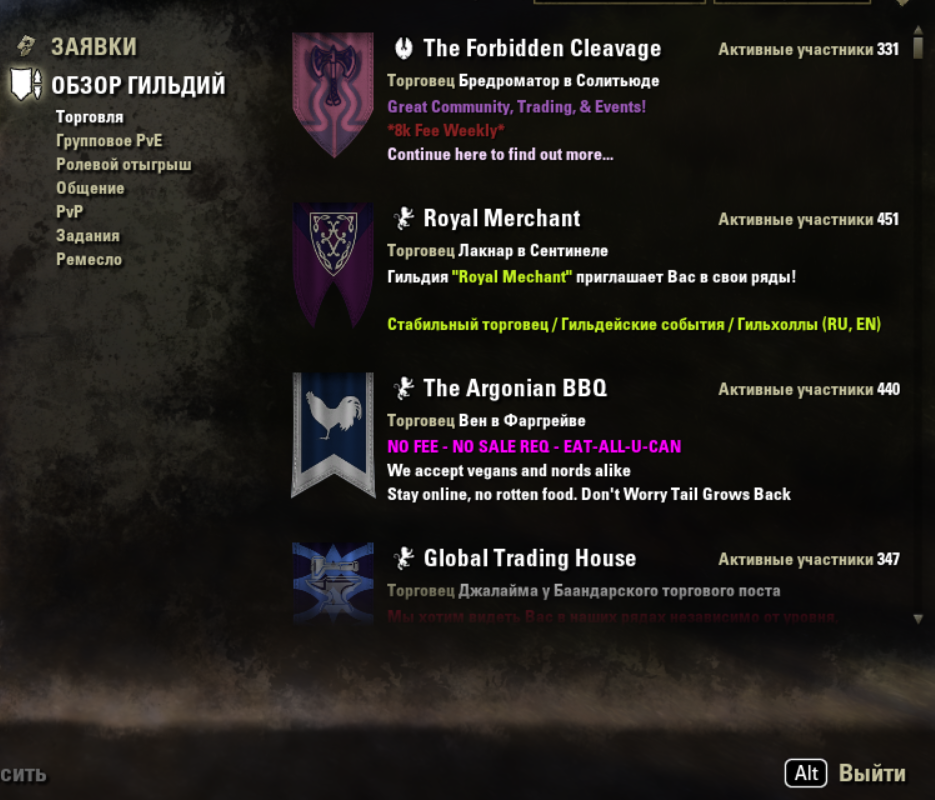 Для этого нажимаем кнопку G и выставляем в фильтр торговлю — где и подбираем подходящую торговую гильдию. Самые посещаемые торговцы расположены на Вварденфелле, Дешаане, Саммерсете, Стормхейвене, Гратвуде так что стараемся вступить в гильдию, которая обладает торговцем в одной из этих областей. Обычно гильдии обладающие такими торговцами выставляют к соискателям требования по минимальному объему продаж или еженедельному налогу. Однако оно того стоит. Продавая товары через «хороших» гильдейских торговцев вы очень быстро сколотите большое состояние и еженедельный налог будет для вас песчинкой в сравнении с объемами золота, что накоплены у вас.