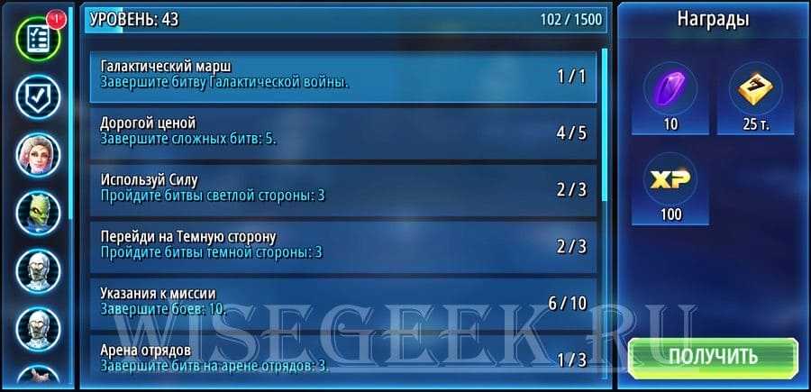 Ежедневные заданий — это своего рода напоминалки по различным игровым активностям за которые дают неплохие награды. Например: пройти битвы на тёмной и светлой стороне, поучаствовать в битвах кантины, завершить испытания и т.д. Здесь выдаётся бесплатная энергия несколько раз в день. Следите за таймером и не упустите свой подарок. Наибольшую награду можно получить если закрыть все ежедневки. В награду здесь можно получить: кристаллы, кредиты, опыт главного героя, тренировочные дроиды и боевые купоны.