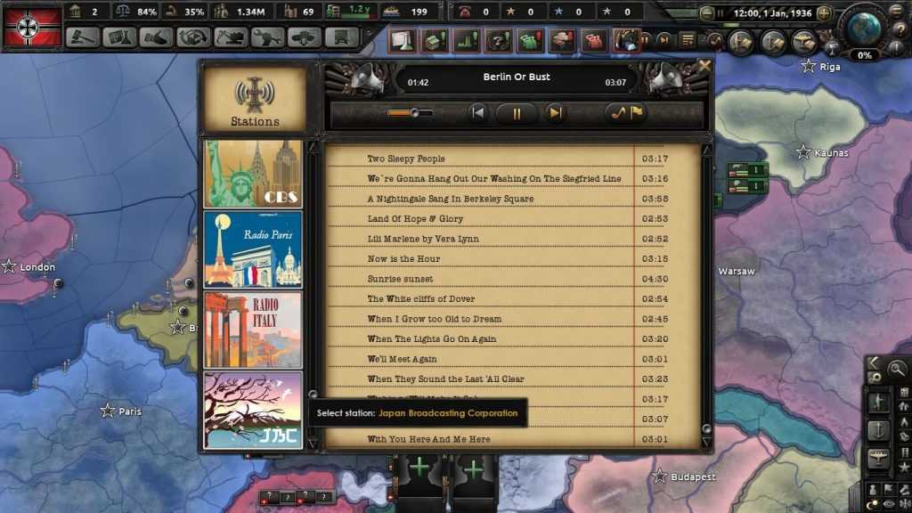 Хотя эпические мелодии HOI4 отлично подходят для драматических событий, было бы неплохо расслабиться, послушав музыку тех времен. Очень увлекательный и на удивление мрачный набор из 600 песен (однако не все из них исторически точные) воссоздает атмосферу тех дней, напоминая игроку, что он ведет миллионы людей к смерти, мукам и бессмертной славе.