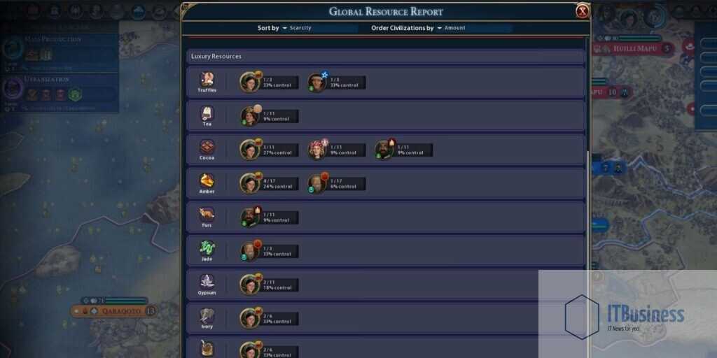 Наконец, игроки, контролирующие значительную часть определенного ресурса, создают монополию на него, предоставляя бонусы к добыче золота и туризму. Чтобы проверить, какие цивилизации имеют какой ресурс, нажмите кнопку «список отчетов» в правом верхнем углу, затем выберите параметр глобального ресурса. При этом будут перечислены все ресурсы в игре и количество принадлежащих каждой цивилизации. Он также расскажет, сколько этой роскоши есть в игровом мире, который игроки могут найти вручную, набрав название роскоши в опции поиска на карте. Постарайтесь найти все ресурсы и поселиться там, прежде чем другие цивилизации заберут их себе. Если город-государство владеет предметами роскоши, он станет его сюзереном.