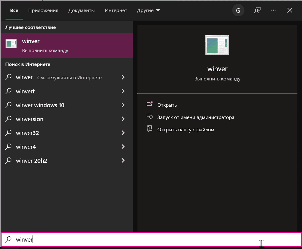 1) В поле поиска введите winver. Затем нажмите на команду winver в результатах.