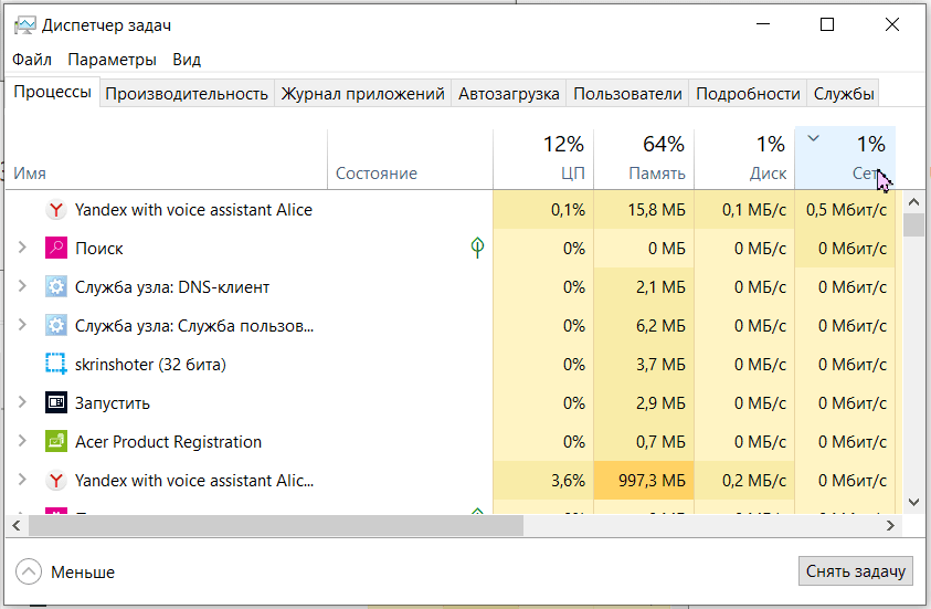 4) Найдите процессы, использующие сеть, и отключите их, щелкнув их правой кнопкой мыши и выбрав «Снять задачу».