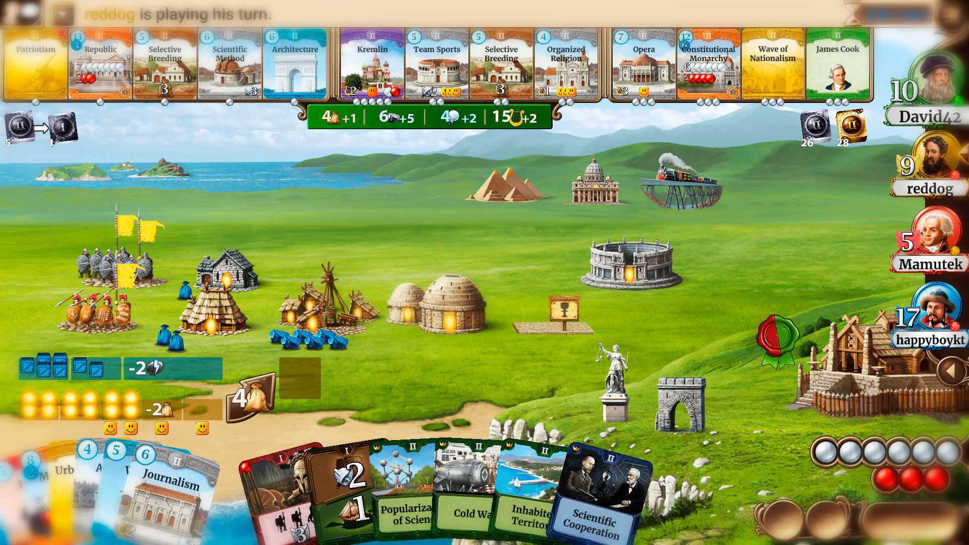 Уже несколько лет остается лучшей настольной игрой, выполненной для любителей компьютерных игр. Проект предлагает двигаться через века, состязаясь в различных сферах. Каждый участник разрабатывает собственную стратегию победы, чтобы при финальном подсчете очков оказаться лучшим. Проект создан в лучших традициях настолок, и предлагает отличный функционал: