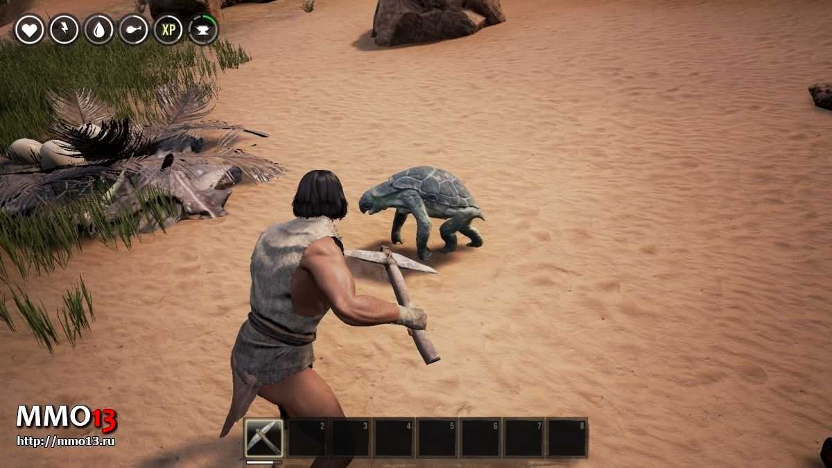 Черепах можно найти вдоль берега. Для их убийства достаточно простенького инструмента или пары ударов руками. Дают то же, что и кролики.