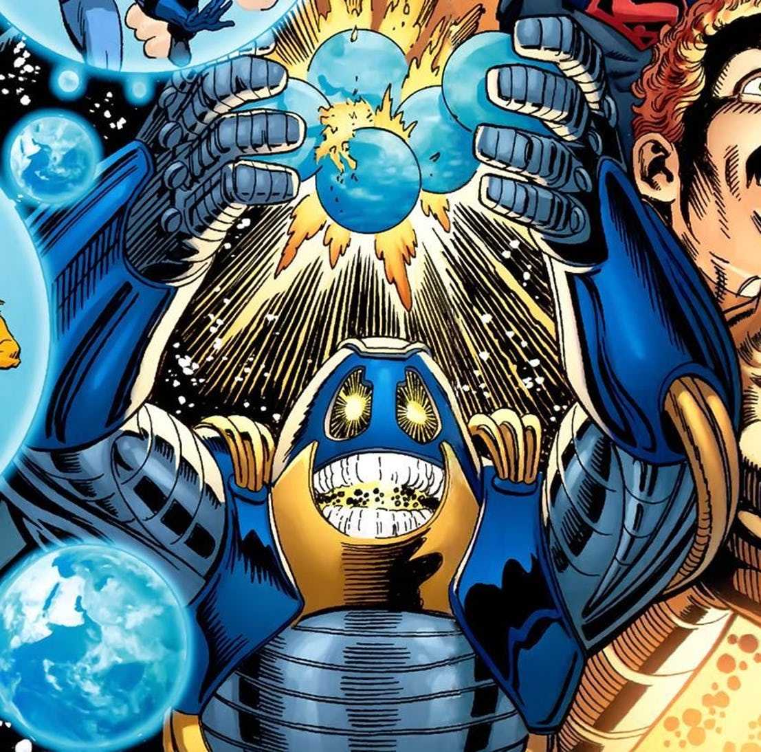Анти-Монитор – это таинственное существо, которое сформировалось из оставшейся космической энергии вселенной. В печально известном мини-сериале «Кризис на бесконечных землях» Антимонитору почти удалось уничтожить мультивселенную. Чтобы победить его, потребовались объединенные усилия ВСЕХ героев и злодеев из мультивселенной. из КАЖДОГО периода времени. Что означало изменение временной шкалы и потерю всех предыдущих версий мультивселенной.