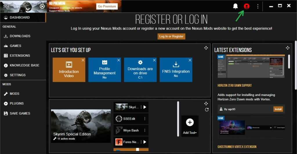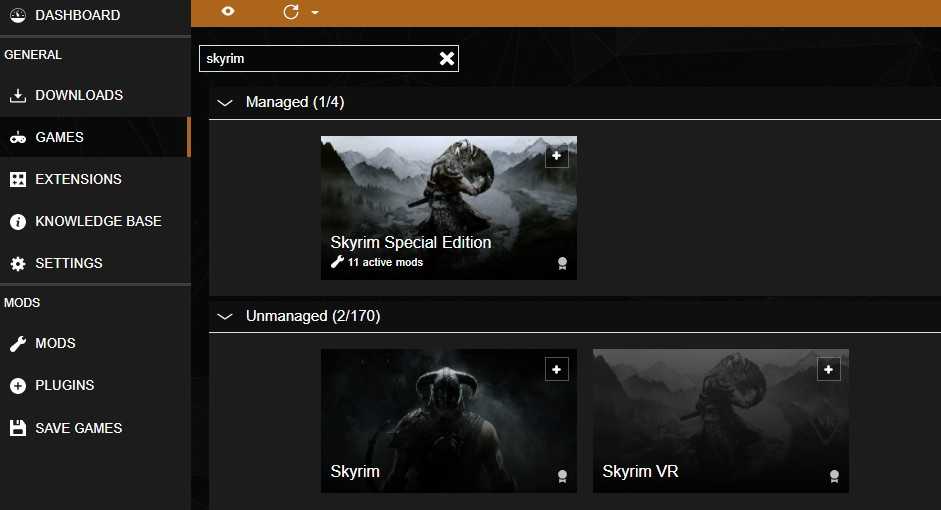 Запустив программу, вам необходимо войти в ваш аккаунт, нажав на соответствующую кнопку в правой верхней части. Подтвердив вход на сайте, возвращаемся в программу, где в разделе Games нужно будет найти установленную версию Skyrim. Если вы уже запускали игру на текущем ПК, она определится программой автоматически. В таком случае игра появится в разделе Managed, и вам останется только навести на неё мышкой и нажать Activate. Если Скайрим не определяется автоматически, вам понадобится указать путь до папки с игрой вручную, нажав на значок плюсика рядом с необходимым изданием, а затем на кнопку Manually Set Location.