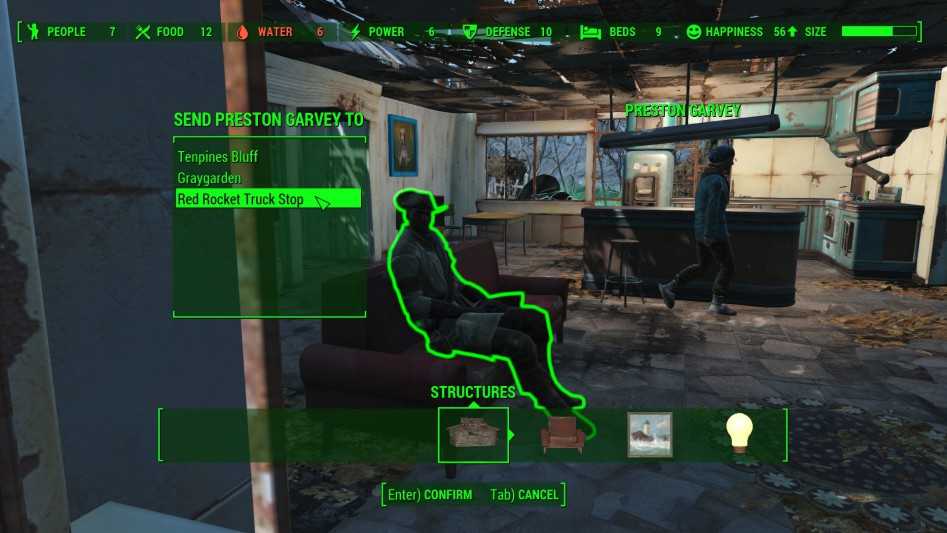 Для этого потребуется перк «Местный лидер», требующий 6 единиц харизмы. Как только вы его получили, входите в режим строительства и жмите Q на рабочем – откроется список поселений под вашим контролем. Выбирайте нужное, и связь между ним и вашим текущим местоположением установлена. Только учтите, что это действие фактически исключит «связного» из жителей поселения и оторвет его от любой работы, которую он выполнял ранее.