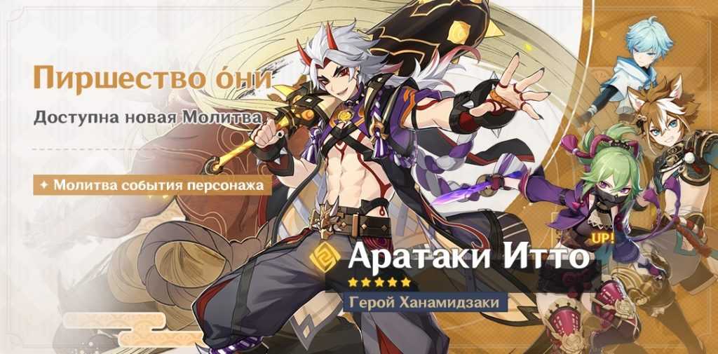 В этом обновлении доступна одна молитва — Пиршество óни с Аратаки Итто и новым 4-звездочным персонажем Куки Синобу.
