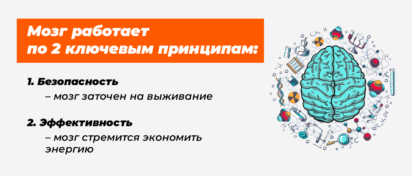 2. Эффективность. Мозг контролирует все процессы в организме – от моргания до аналитического мышления. Единственный способ выполнить все это – эффективно распределять энергию. И мозг стремится постоянно экономить энергию, чтобы делать больше с меньшими затратами.
